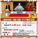 2022年10月20日 / 最終更新日時 : 2022年10月20日 chihaya2_admin newsオンライン回覧板 11月20日(日)に千早二寄席 11月20日(日)13:30~15:30に区民ひろば千早で、恒例の千早二寄席が開かれます。誠に残念なことに三遊亭圓窓師匠はお亡くなりになられましたが、おなじみ一龍齋貞心先生の講談、三遊亭窓輝師匠の落語に加えて、エンジョイJoyさんのパントマイムをお楽しみいただきます。
